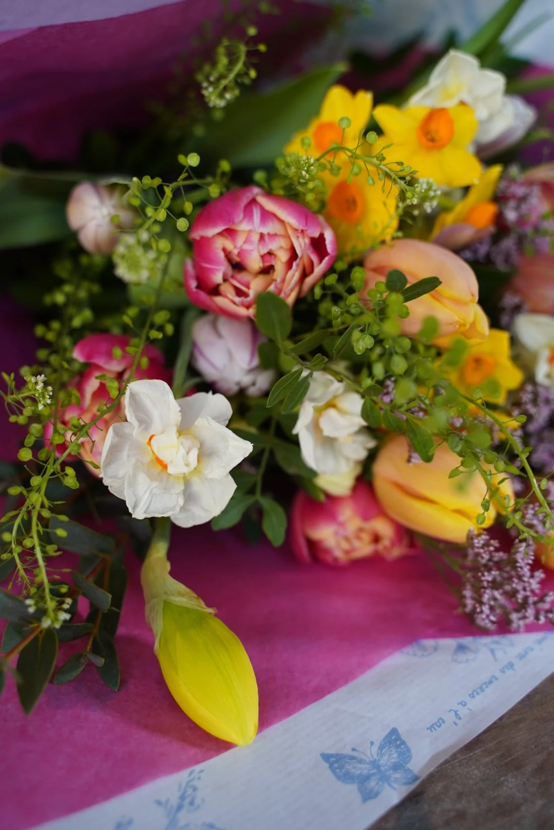 A fresh, spring Easter posy using British, locally grown and sourced flowers, designed to bring a touch of Easter joy into your home.